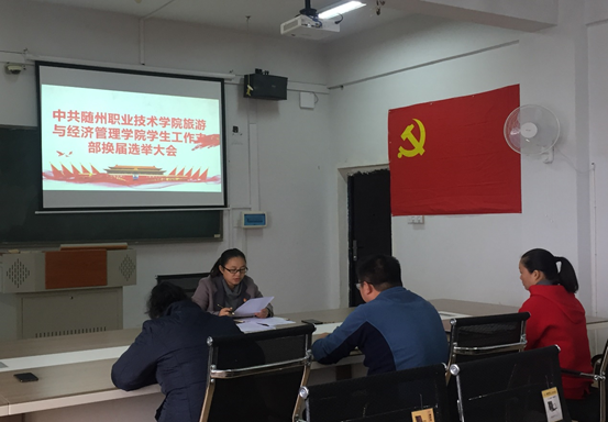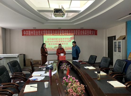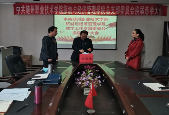 中共随州职业技术学院旅游与经济管理学院总支部委员会换届选举产生了新一届的总支部委员会,分别由:魏丹、江珂、于晓光、郝浩、聂莎组成,魏丹同志当选为新一届总支部书,魏丹同志表示:在今后工作中要加强学习,不断实践,身先士卒,率先垂范,不忘初心,牢记使命,增强凝聚力和向心力,把旅游与经济管理学院建设的更好。
