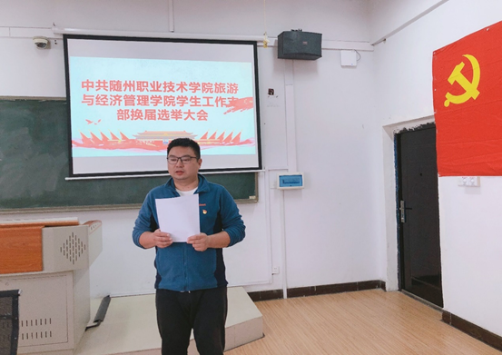 中共随州职业技术学院旅游与经济管理学院学生工作支部换届选举大会产生了新一届学生支部书记郝浩同志。郝浩同志表示在今后的工作中一定要加强学习,努力扎实地开展工作,为大家服务好。