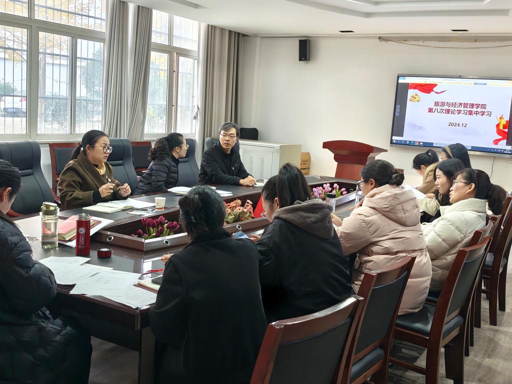 2024年12月6日,旅游与经济管理学院在商务谈判室开展集中理论学习,此次学习的主题内容是《中国共产党第二十届中央委员会第三次全体会议公报》,会议由院长曾建平主持,党总支副书记江珂领学文件,全体党员教师参加学习。