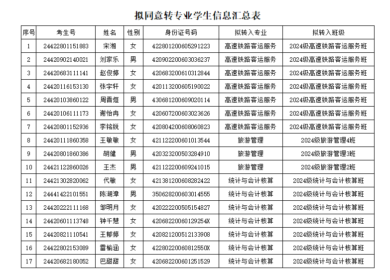 旅游与经济管理学院于2024年12月11日下午14:30-16:10在霞客楼5308组织了2024级学生转专业笔试;2024年12月12日下午14:30-16:10在霞客楼5309组织了2024级学生转专业面试。按转入计划,旅游与经济管理学院拟录取17名学生,先对录取学生名单进行公示。