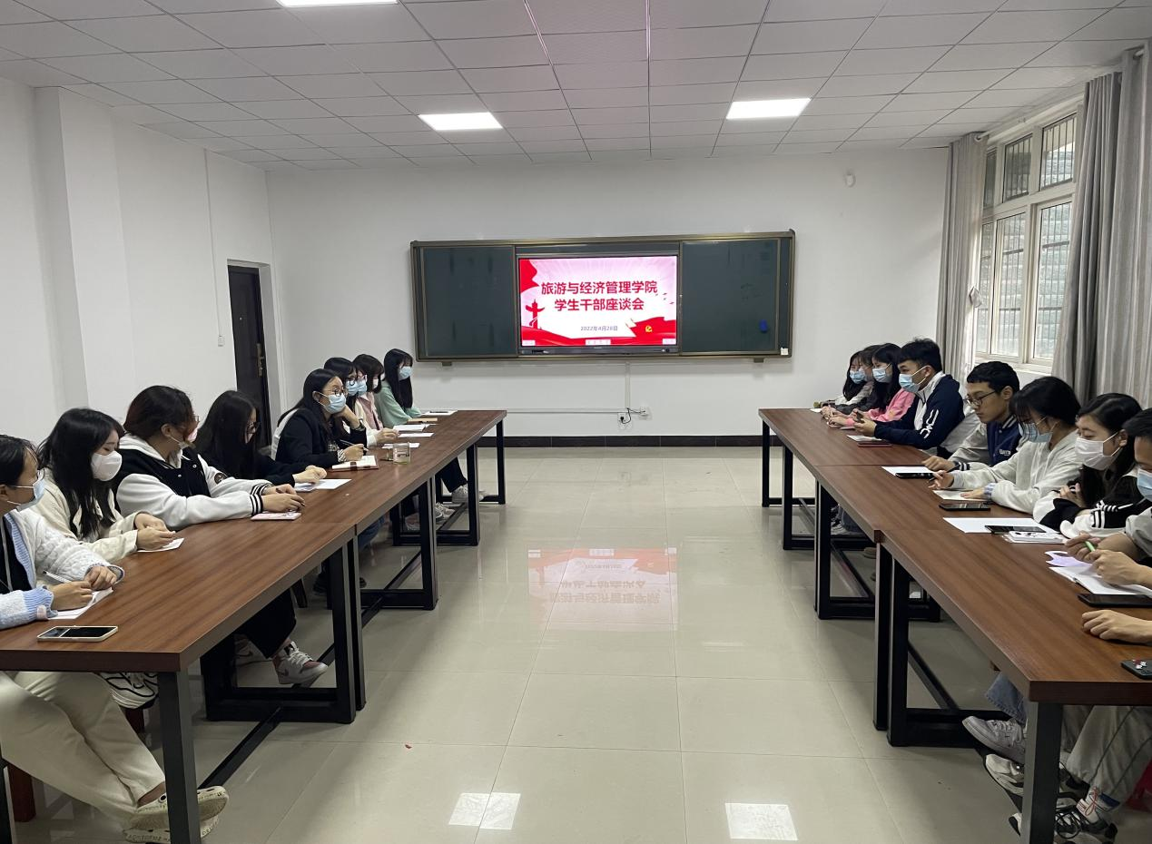 4月28日中午,旅游与经济管理学院在党团活动室举行“喜迎二十大汇聚青春正能量交流分享促成长”学生干部座谈会,深入了解我院学生干部队伍现状及学生诉求,倾听学生心声,提升学生干部工作实效。党总支副书记江珂同志以及学生干部代表参加了会议。