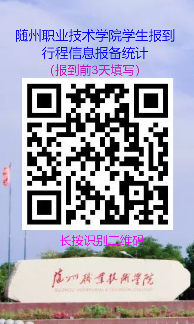 2.按照疫情防控工作要求,各位同学务必提前扫码填写“随州职业技术学院学生报到行程信息报备统计表”,将到校行程报备给学校,包括起止地点(详细到街道、社区)和时间、每段行程起止地点、时间和交通工具信息(注明车次及座位号、航班号)等,9月12日前填写完毕。