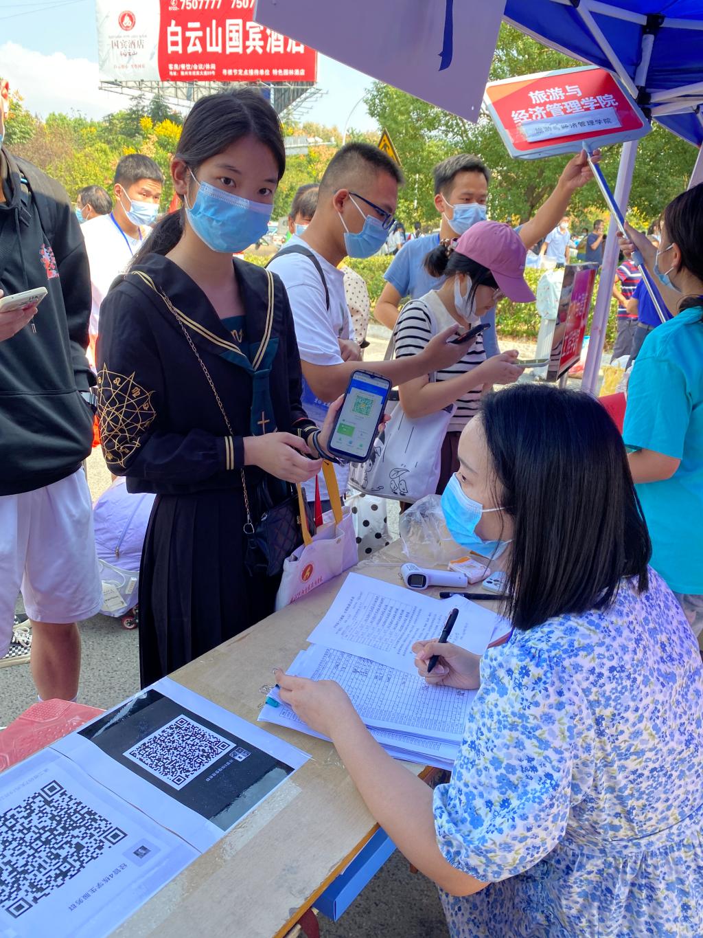 按照学校疫情防控工作安排,新生在校门口完成了相关入校审批手续,经过测温、消毒、身份核验和出示健康码、行程卡、七天健康监测行程轨迹表、核酸检测阴性证明等流程后,由专用通道入校。