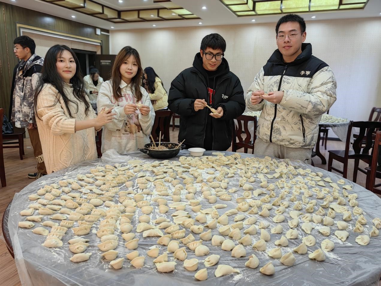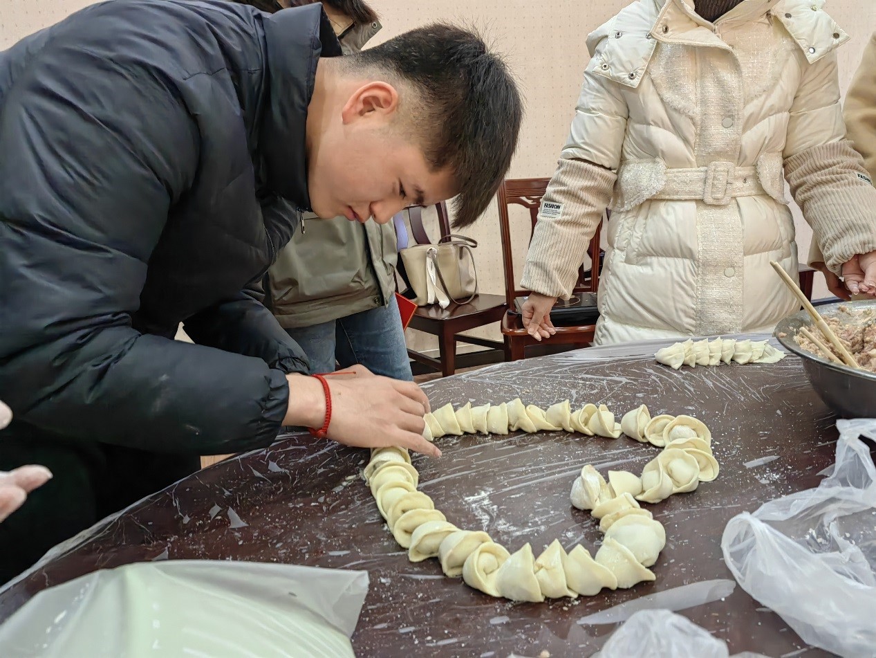 活动伊始,师生围坐在一起,挽起衣袖包饺子,一张张面皮经过巧手塑造,形状各异的饺子便出现在了众人面前。柳叶饺、元宝饺、半月饺、波浪饺、四喜饺、太阳花饺......大家分工合作,师生互相学习,在劳动中分享经验,在协作中交流情感,在行动中喜迎新年。