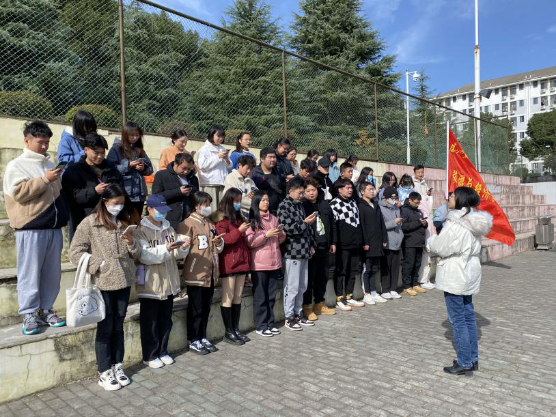 一首红歌开启了本次党团活动,只见同学们整齐地站在台阶上,在薛小雅老师的指导下,伴随着慷慨激昂的音乐旋律,大家热情齐唱《唱支山歌给党听》。随后,在“桃花朵朵开”趣味游戏中,所有人员打乱顺序,围成一个大圆圈小跑起来,在主持人的带领下,大家喊数抱团。在短时间内老师与同学们的激情与状态快速升温,彼此之间的距离也进一步拉近。