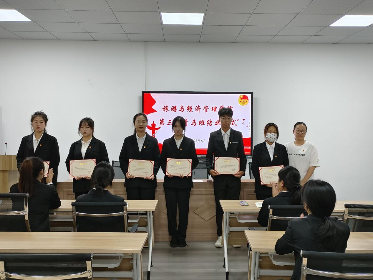 6月16日,旅游与经济管理学院第三期青马班结业仪式在旅游培训中心举行。院党总支副书记江珂、学工办主任宋萍、辅导员王琰及全体学员参加典礼。团总支书记何湛苑主持仪式。
