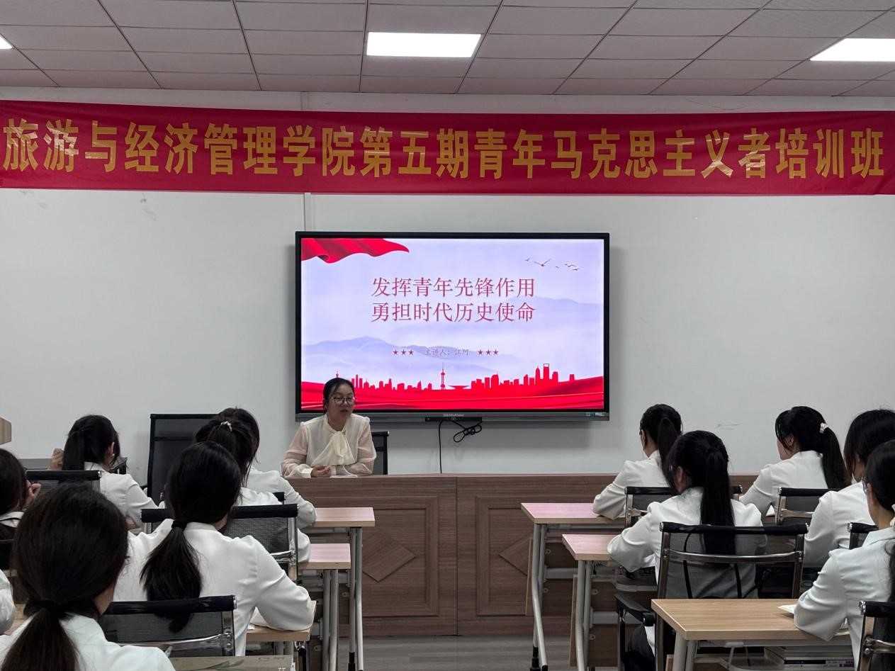 6月5日,旅游与经济管理学院党总支副书记江珂于霞客楼一楼旅游培训教室,开展“发挥青年先锋作用 勇担时代历史使命”主题授课,为青马班学员带来一堂意义深刻的思政课。