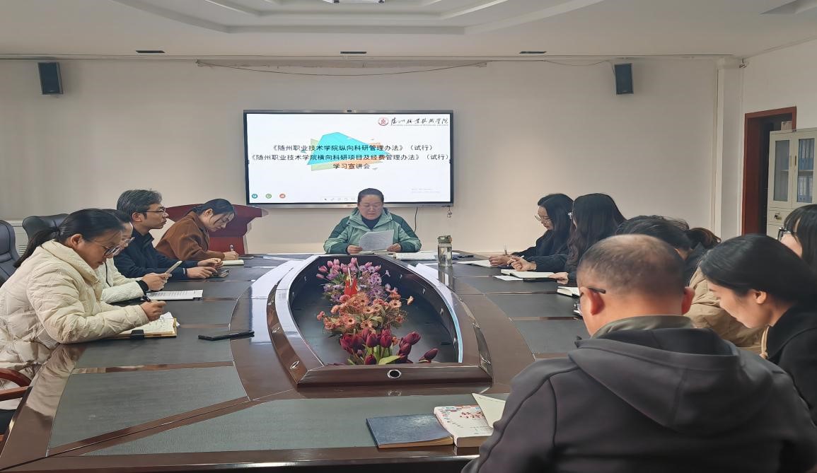 为贯彻落实新修订的《随州职业技术学院纵向科研管理办法》(试行)《随州职业技术学院横向科研项目及经费管理办法》(试行)文件精神,激发学院教师开展纵向科研和横向科研项目的积极性,按照学校的统一部署,2024年11月21日旅游与经济管理学院召开了新管理办法宣讲会。学院领导及相关教师参加了会议。