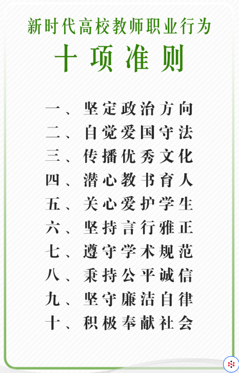 八、秉持公平诚信。坚持原则,处事公道,光明磊落,为人正直;不得在招生、考试、推优、保研、就业及绩效考核、岗位聘用、职称评聘、评优评奖等工作中徇私舞弊、弄虚作假。